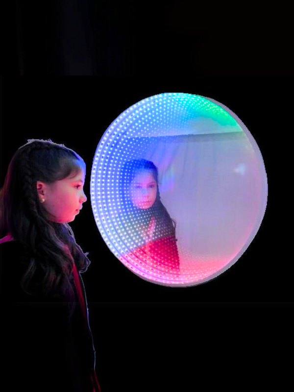 Great addition to any sensory room. The large round infinity mirror is approx. 60cm diameter and when turned on, creates an amazing infinity effect that adds an element of interest. The rings of LEDS create a tunnel effect to any wall floor or ceiling. This item has the bonus of extra-large playful interactive (rechargeable) buttons, tap the button to watch the item change colour, or light sequence. Leave the buttons alone and watch the infinity lights change colour, Circling around the display creating a mesmerising colours and patterns.