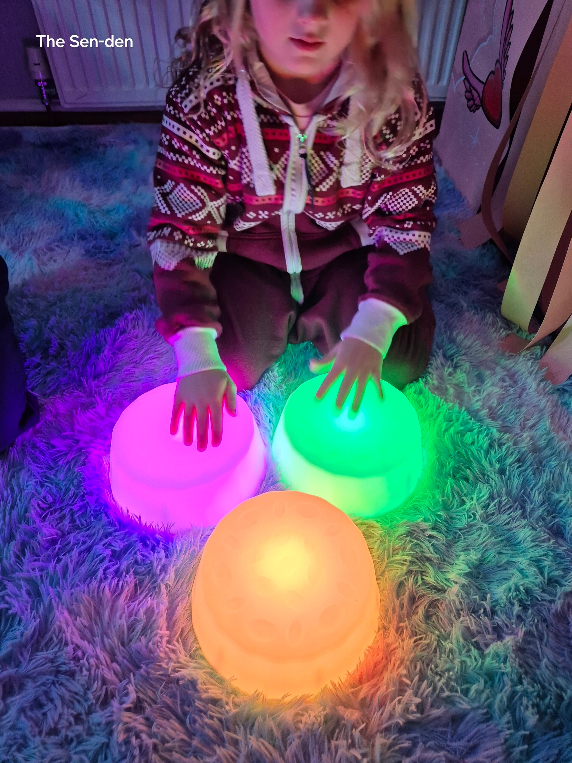 Designed with durability in mind, the smooth yet tactile surfaces provide a captivating visual and sensory experience that instantly engages children. Whether arranged as stepping stones, used to create a calming sensory zone, or set up as an interactive pathway, these glowing pods offer a simple yet enchanting way to support movement, focus, and sensory development.