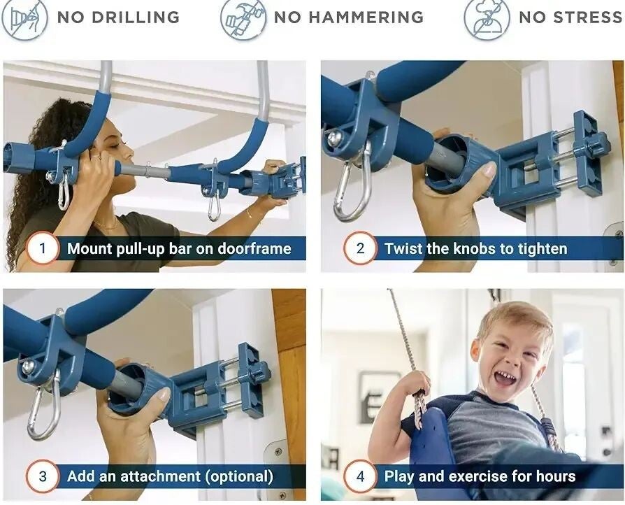 The doorway sensory swing is designed to fit most home door frames, adapting to widths from 25" to 36". With easy installation, it can be installed without drilling holes in the wall and the height of the swing can be adjusted to accommodate different users.